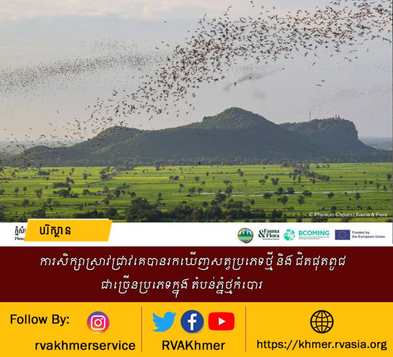 តាមរយៈ របាយការណ៍ស្តីពីការសិក្សាបានបង្ហាញពីការរកឃើញ ជីវ:ចម្រុះនៅតំបន់ភ្នំថ្មកំបោរ ខេត្តបាត់ដំបងនៃសត្វប្រភេទថ្មី និង ជិតផុតពូជជាច្រើនប្រភេទ។ តាមរយៈកិច្ចសហការ ជាមួយក្រសួងបរិស្ថាន អង្គការសត្វព្រៃ និងរុក្ខជាតិ ឱ្យដឹងថាការរកឃើញសត្វប្រភេទថ្មីនេះមានដូចជា តុកកែថ្មីចំនួន ៣ ប្រភេទ ខ្យង ២ប្រភេទ ប្រភេទម្រើមព្រះ ២ប្រភេទ ដែលត្រូវបានបោះពុម្ពផ្សាយជាសាធារណ: ខណៈដែលតុកកែថ្មីចំនួន ៣ ប្រភេទទៀតដូចជា (Gehyra sp. nov.) (Cyrtodactylus sp. nov. ) និង (Dixonius sp. nov.) និងប្រភេទពស់ pit viper (Trimeresurus sp. nov.) កំពុងត្រូវបានពិពណ៌នា។