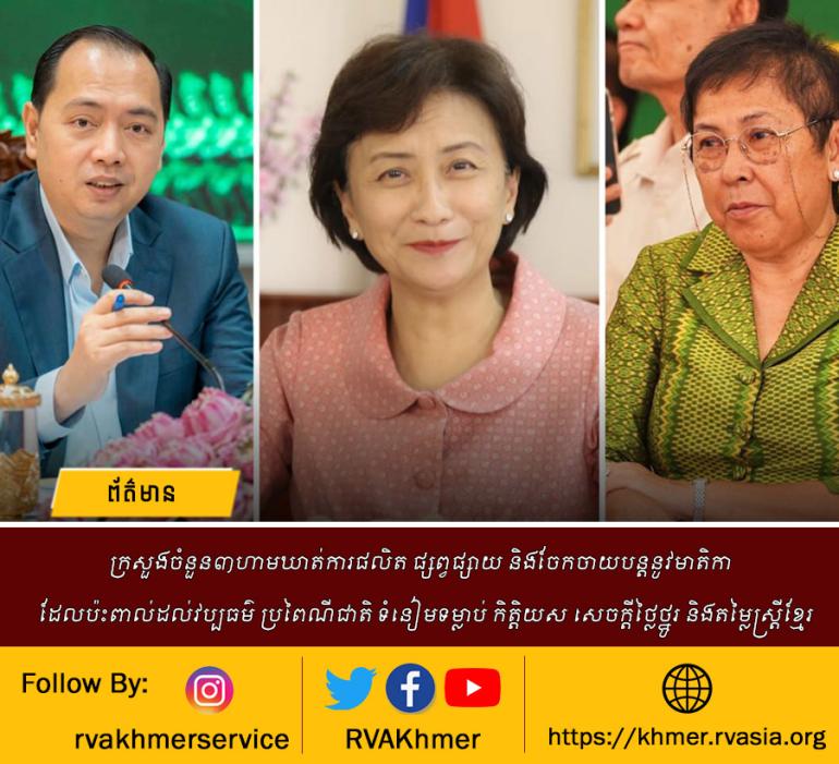 ក្រសួងចំនួន៣ហាមឃាត់ការផលិត ផ្សព្វផ្សាយ និងចែកចាយបន្តនូវមាតិកា ដែលប៉ះពាល់ដល់វប្បធម៌ ប្រពៃណីជាតិ ទំនៀមទម្លាប់ កិត្តិយស សេចក្តីថ្លៃថ្នូរ និងតម្លៃស្ត្រីខ្មែរ