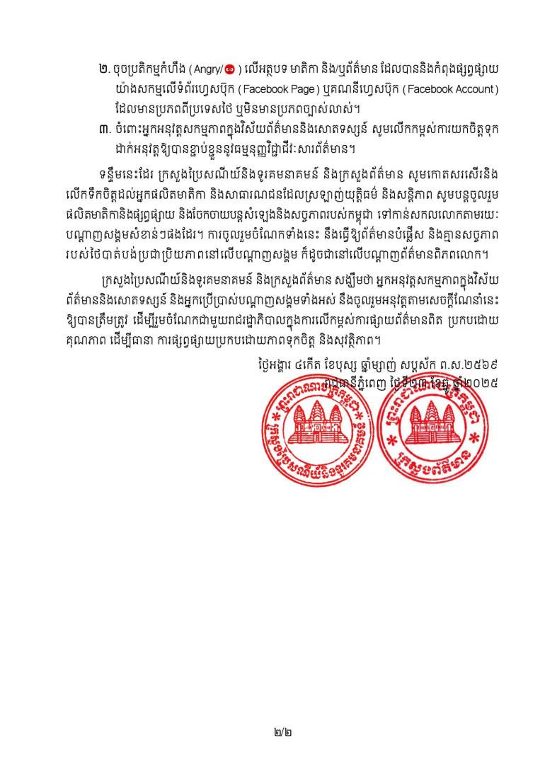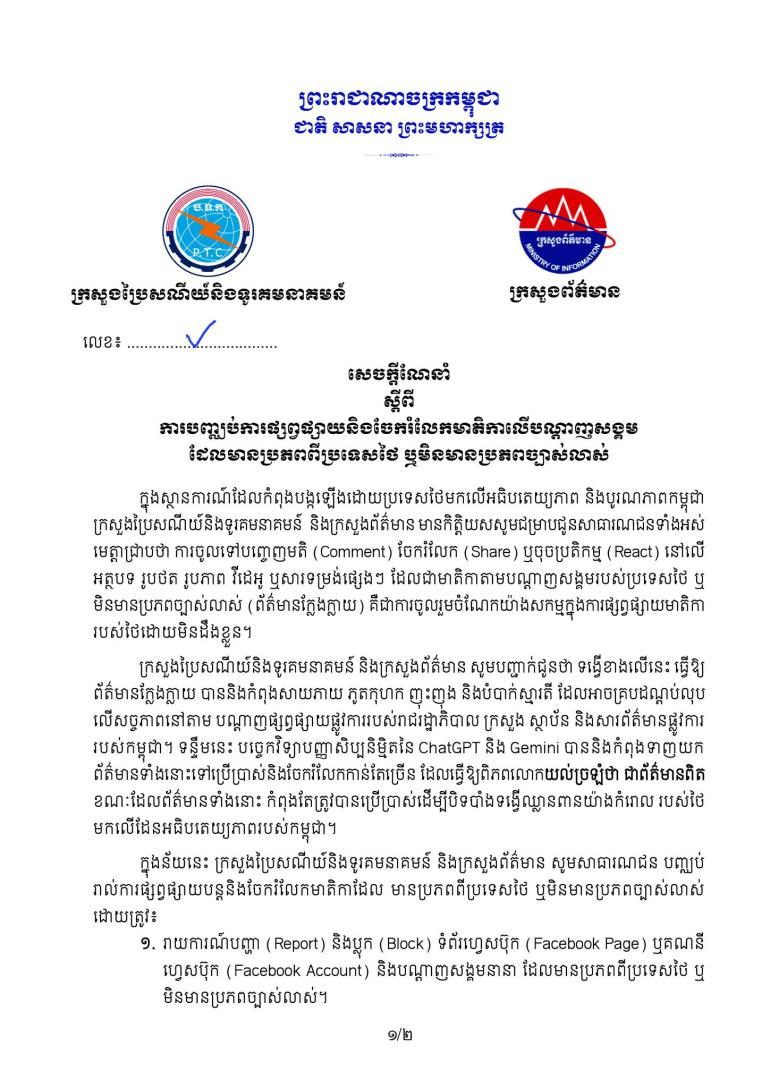 ក្រសួងព័ត៌មាន និងក្រសួងប្រៃសណីយ៍ និងទូរគមនាគមន៍ នៅថ្ងៃទី២៣ ខែធ្នូ ឆ្នាំ២០២៥នេះ បានចេញសេចក្តីណែនាំ ស្តីពី ការបញ្ឈប់ការផ្សព្វផ្សាយ និងចែករំលែកមាតិកាលើបណ្តាញសង្គម ដែលមានប្រភពពីប្រទេសថៃ ឬមិនមានប្រភពច្បាស់លាស់។