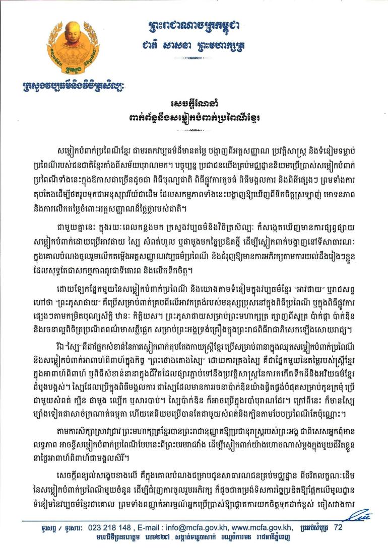 យោងតាមសេចក្ដីណែនាំរបស់ ក្រសួងវប្បធម៌ នាថ្ងៃទី២៦ កុម្ភៈ បានគូសបញ្ជាក់ថា «សូមអំពាវនាវដល់សាធារណជន ជាពិសេសអ្នកច្នៃម៉ូតសម្លៀកបំពាក់ សូមព្យាយាម សិក្សាស្រាវជ្រាវឈ្វេងយល់ឱ្យច្បាស់អំពីប្រវត្តិសម្លៀកបំពាក់ប្រពៃណី ទាំងទម្រង់ និងបរិបទដើមនៃការប្រើប្រាស់ មុននឹង ប្រើប្រាស់ជាសាធារណៈ ព្រោះហេតុថា ការស្រឡាញ់ពេញចិត្តណាមួយ ឬការប្រើប្រាស់អ្វីមួយ ដោយពុំមានការស្វែងយល់ ពីតម្លៃ និងឫសគល់ដើមឱ្យច្បាស់លាស់នោះ អាចនាំមកនូវលទ្ធផលអវិជ្ជមាន ធ្វើឱ្យខូចខាតឬបាត់បង់តម្លៃនៃបេតិកភណ្ឌ ជាតិខ្លួនទៅវិញ»។
