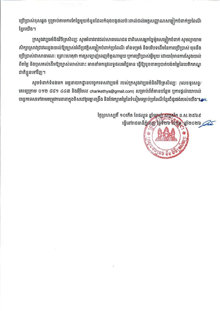 ក្រសួងវប្បធម៌ និង វិចិត្រសិល្បៈ បានអំពាវនាវដល់អ្នកច្នៃម៉ូតសម្លៀកបំពាក់ ព្យាយាម និងសិក្សាស្រាវជ្រាវឈ្វេង យល់ឱ្យច្បាស់អំពីប្រវត្តិ សម្លៀកបំពាក់ប្រពៃណី មុននឹងប្រើប្រាស់ជាសាធារណៈ។