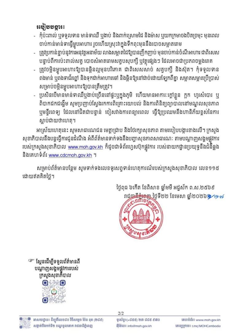 ក្រសួងសុខាភិបាល បានប្រកាសពីករណីជំងឺផ្តាសាយបក្សី ចំនួន ០១ករណី កើតលើស្ត្រីអាយុ ៦៦ឆ្នាំ ដែលត្រូវបានបញ្ជាក់ថា មានវិជ្ជមានវីរុសផ្តាសាយបក្សី ប្រភេទហាស់៥ អ៊ុន១ (H5N1) នៅថ្ងៃទី២១ ខែមេសា ឆ្នាំ២០២៦ ដោយវិទ្យាស្ថានជាតិសុខភាពសាធារណៈ។ អ្នកជំងឺមានទីលំនៅក្នុងភូមិត្រពាំងថ្កូវ ឃុំពងទឹក ស្រុករំដួល ខេត្តស្វាយរៀង។ អ្នកជំងឺត្រូវបានដាក់ឱ្យសម្រាក ដាច់ដោយឡែកនៅមន្ទីរពេទ្យ និងទទួលការព្យាបាលថែទាំយ៉ាងយកចិត្តទុកដាក់ពីក្រុមគ្រូពេទ្យ។ តាមការសាកសួរ បានបង្ហាញថា ចាប់ពីថ្ងៃទី២ ដល់ថ្ងៃទី១៣ ខែមេសា នៅក្នុងភូមិកើតហេតុ និងផ្ទះអ្នកជំងឺមានមាន់ឈឺ និងងាប់ ហើយក៏បានយកមកធ្វើម្ហូប។