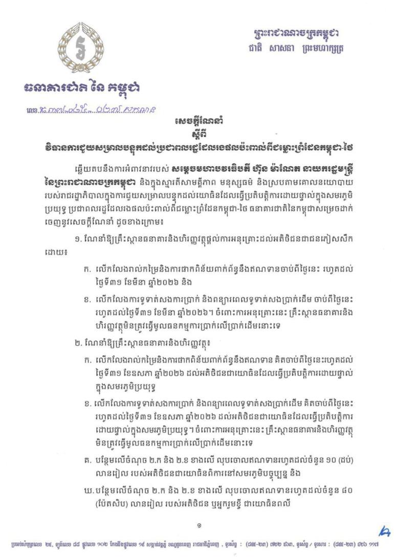 ថ្ងៃនេះ ធនាគារជាតិនៃកម្ពុជា បានចេញសេចក្តីណែនាំថ្មីមួយ ស្តីពីវិធានការជួយសម្រាលបន្ទុកដល់ប្រជាពលរដ្ឋ និងយោធិន ដែលរងផលប៉ះពាល់ដោយផ្ទាល់ពីបញ្ហាជម្លោះព្រំដែនកម្ពុជា–ថៃ។ វិធានការនេះ ត្រូវបានផ្តល់ចេញតាមការអំពាវនាវរបស់ សម្តេចមហាបវរធិបតី ហ៊ុន ម៉ាណែត នាយករដ្ឋមន្ត្រីនៃព្រះរាជាណាចក្រកម្ពុជា ដើម្បីបង្ហាញពីស្មារតីសាមគ្គីភាព មនុស្សធម៌ និងគោលនយោបាយរបស់រាជរដ្ឋាភិបាលក្នុងការការពារ និងគាំទ្រប្រជាពលរដ្ឋនៅតំបន់ព្រំដែន។