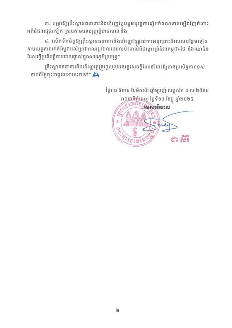 ធនាគារជាតិ ចេញសេចក្តីណែនាំជួយសម្រាលបន្ទុកប្រជាពលរដ្ឋ និងយោធិន រងផលប៉ះពាល់ពីជម្លោះព្រំដែនកម្ពុជា-ថៃ