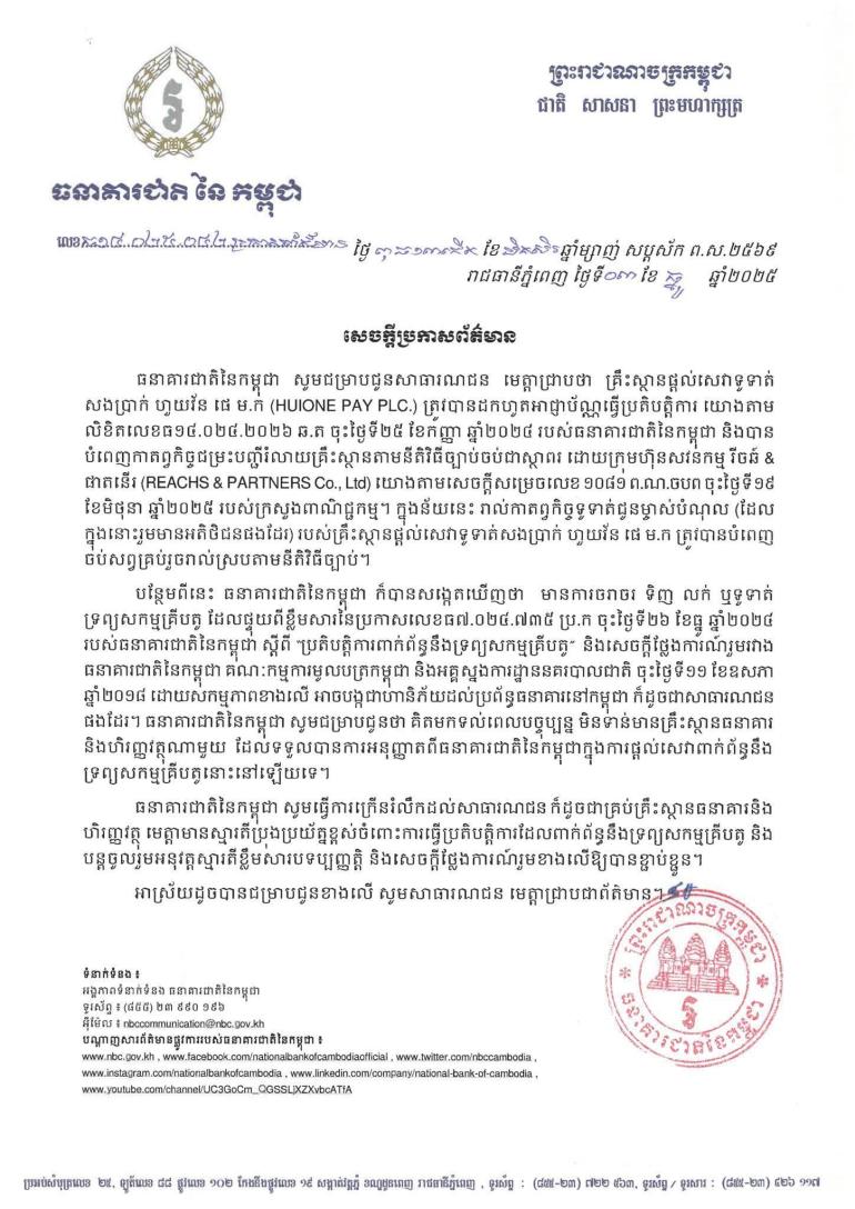 យោងតាមសេចក្ដីប្រកាសព័ត៌មានរបស់ ធនាគារជាតិនៃកម្ពុជា នៅថ្ងៃទី៣០ ខែធ្នូ ឆ្នាំ២០២៥ បានឲ្យដឹងថា គ្រឹះស្ថានផ្តល់សេវាទូទាត់ សងប្រាក់ ហួយវ័ន ផេ ម.ក (HUIONE PAY PLC.) ត្រូវបានដកហូតអាជ្ញាប័ណ្ណធ្វើប្រតិបត្តិការ យោងតាម លិខិតរបស់ធនាគារជាតិនៃកម្ពុជា និងបានបំពេញកាតព្វកិច្ចជម្រះបញ្ជីរំលាយគ្រឹះស្ថានតាមនីតិវិធីច្បាប់ចប់ជាស្ថាពរ ដោយក្រុមហ៊ុនសវនកម្ម រីចន៍ & ជាតនើរ (REACHS & PARTNERS Co., Ltd) យោងតាមសេចក្តីសម្រេច របស់ក្រសួងពាណិជ្ជកម្ម។