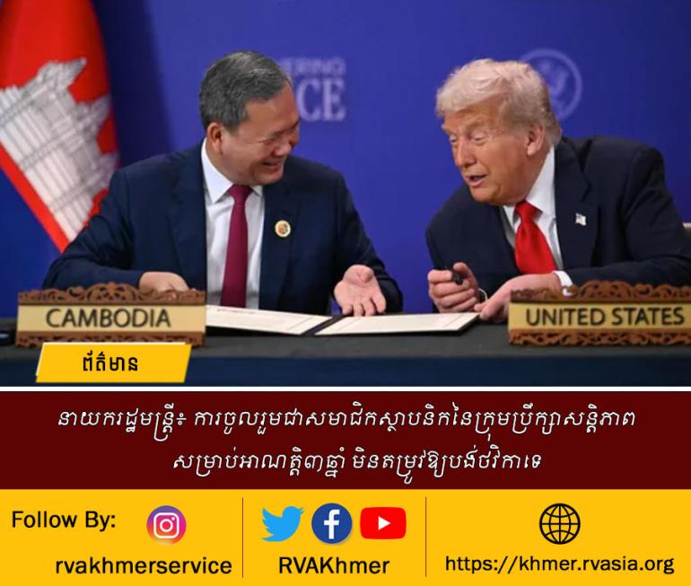 សម្តេចមហាបវរធិបតី ហ៊ុន ម៉ាណែត នាយករដ្ឋមន្ត្រីនៃព្រះរាជាណាចក្រកម្ពុជា បានឱ្យដឹងថា កម្ពុជាសម្រេចចូលរួមជាសមាជិកស្ថាបនិកនៃក្រុមប្រឹក្សាសន្តិភាព (The Board of Peace) តាមការអញ្ជើញរបស់លោកប្រធានាធិបតីសហរដ្ឋអាមេរិក Donald J. Trump កាលពីថ្ងៃទី១៦ ខែមករា ឆ្នាំ២០២៦។