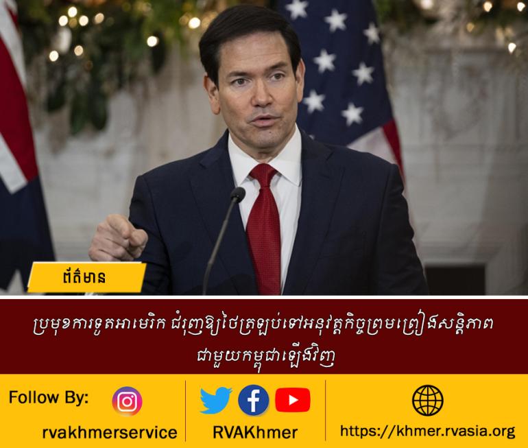 រដ្ឋមន្ត្រីការបរទេសអាមេរិក លោក Marco Rubio បានបើកកិច្ចសន្ទនាតាមទូរស័ព្ទជាមួយរដ្ឋមន្ត្រីការបរទេសថៃ លោក Sihasak Phuangketkeow ជាមួយការជំរុញឱ្យថៃត្រឡប់ទៅ អនុវត្តកិច្ចព្រមព្រៀងសន្តិភាពទីក្រុងគូឡាឡាំពួឡើងវិញ។ នេះបើតាមការចេញផ្សាយក្រសួងការបរទេសអាមេរិក នៅថ្ងៃទី១៨ ខែធ្នូ។