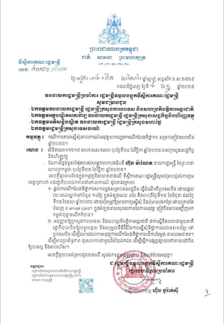 រាជរដ្ឋាភិបាលកម្ពុជា បានសម្រេចផ្តល់ការលើកលែងទិដ្ឋាការសាកល្បង សម្រាប់ពលរដ្ឋចិន ធ្វើដំណើរពីប្រទេសចិន ដោយផ្តល់រយៈពេលស្នាក់នៅចំនួន ១៤ថ្ងៃ ក្នុងអំឡុងពេល ៤ខែ គិតចាប់ពីថ្ងៃទី១៥ ខែមិថុនា ដល់ថ្ងៃ ទី១៥ ខែតុលា ឆ្នាំ២០២៦ ដោយពុំតម្រូវឱ្យមានពាក្យស្នើសុំ និងពុំមានបង់កម្រៃ ដោយគ្រាន់តែបំពេញ E-arrival card ប៉ុណ្ណោះ។ នេះបើតាមលិខិតរបស់ទីស្តីការគណៈរដ្ឋមន្ត្រី ដែលផ្សព្វផ្សាយនៅព្រឹកថ្ងៃទី៣ ខែធ្នូនេះ។