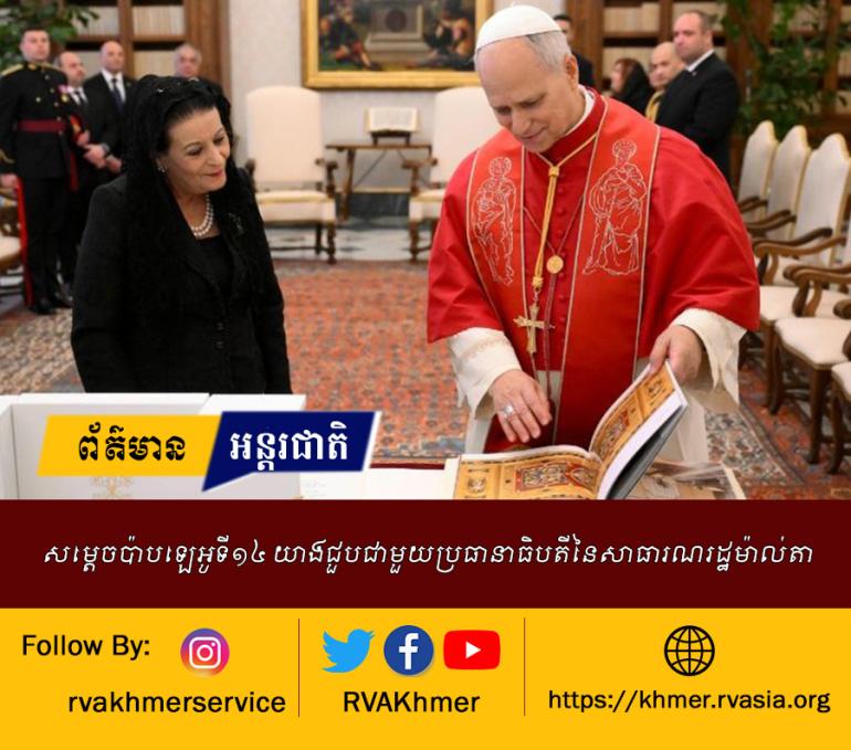 សម្តេចប៉ាប ឡេអូ ទី១៤ បានយាងជួបសាវនាការងារជាមួយប្រធានាធិបតីនៃសាធារណរដ្ឋម៉ាល់តា លោកស្រី មីរៀម ស្ពៃតេរី ដេបូណូ (Myriam Spiteri Debono) នៅបុរីវ៉ាទីកង់។ នេះបើតាមវ៉ាទីកង់ញូវ ។