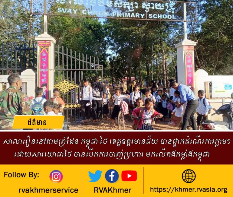 សាលារៀននៅតាមព្រំដែន កម្ពុជា-ថៃ ខេត្តឧត្តរមានជ័យ បានផ្អាកដំណើរការភ្លាមៗ ដោយសារយោធាថៃ បានបើកការបាញ់ប្រហារ មកលើកងកម្លាំងកម្ពុជា
