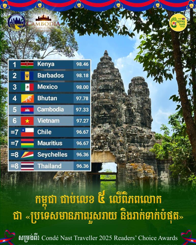ព្រះរាជាណាចក្រកម្ពុជាត្រូវបានទទួលស្គាល់ថា ជាប្រទេសដែលមានភាពរាក់ទាក់បំផុតលំដាប់ទីប្រាំ នៅលើពិភពលោក នៅក្នុងពានរង្វាន់ជម្រើសអ្នកអាន Condé Nast Traveller ឆ្នាំ ២០២៥ (Condé Nast Traveller 2025 Readers’ Choice Awards)។