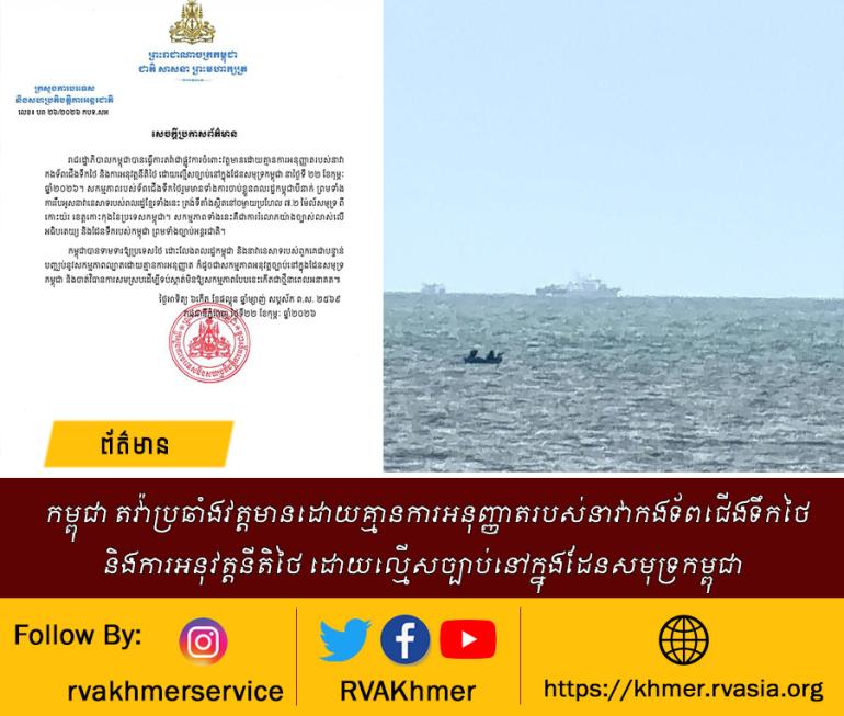 កម្ពុជា តាមរយៈក្រសួងការបរទេស និងសហប្រតិបត្តិការអន្តរជាតិ នៅថ្ងៃទី២២ ខែកុម្ភៈ ឆ្នាំ២០២៦ បានចេញសេចក្ដីប្រកាសតវ៉ាជាផ្លូវការចំពោះវត្តមានដោយគ្មានការអនុញ្ញាតរបស់នាវា កងទ័ពជើងទឹកថៃ និងការអនុវត្តនីតិថៃ ដោយល្មើសច្បាប់នៅក្នុងដែនសមុទ្រកម្ពុជា នាថ្ងៃទី ២២ ខែកុម្ភៈ ឆ្នាំ២០២៦។