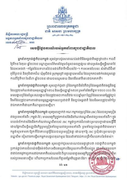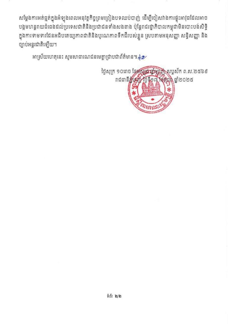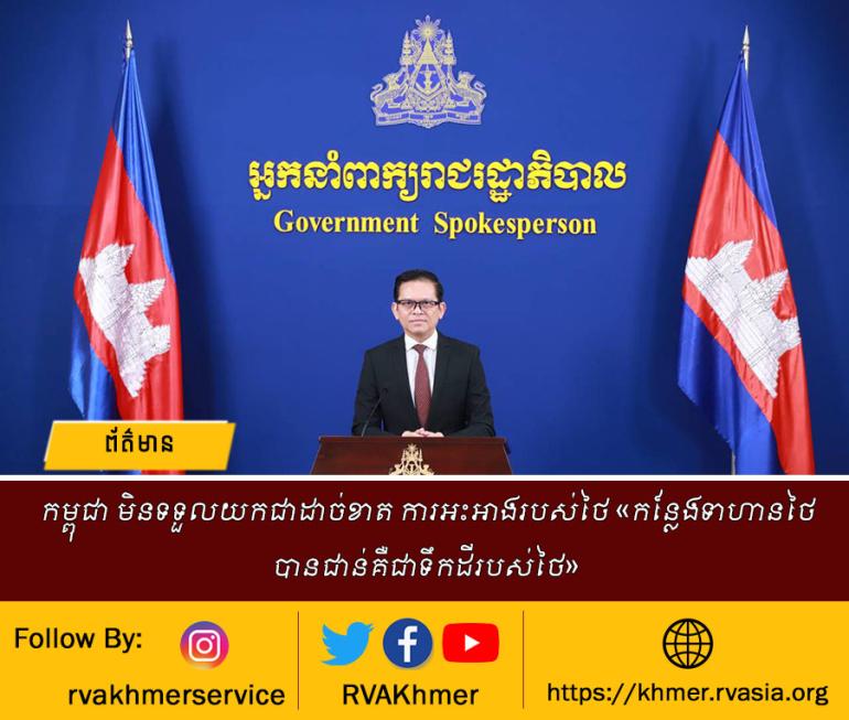 នៅក្នុងសេចក្តីប្រកាសព័ត៌មានរបស់ អង្គភាពអ្នកនាំពាក្យរាជរដ្ឋាភិបាល នៅព្រឹកថ្ងៃទី១៧ ខែតុលានេះ បានបង្ហាញថា «រាជរដ្ឋាភិបាលកម្ពុជាប្រកាន់ខ្ជាប់គោលជំហរយ៉ាងម៉ឺងម៉ាត់ចំពោះអធិបតេយ្យភាពនិងបូរណភាពទឹកដីរបស់ខ្លួន ដោយមិនទទួលយកជាដាច់ខាតនូវការប្រកាសជាឯកតោភាគីរបស់យោធាថៃ ពីព្រោះយោធាគ្មានសមត្ថកិច្ចក្នុងការសម្រេចអំពីខណ្ឌសីមារបស់ប្រទេសនោះឡើយ ហើយការប្រកាសបែបនេះក៏គ្មានតម្លៃគតិយុត្តនោះដែរ។ ទោះជារាជរដ្ឋាភិបាលកម្ពុជាសម្ដែងការអត់ធ្មត់ក្នុងអំឡុងពេលអនុវត្តកិច្ចព្រមព្រៀងបទឈប់បាញ់ ដើម្បីចៀសវាងការផ្ទុះអាវុធដែលអាចបង្កមហន្តរាយធំធេងដល់ប្រទេសជាតិនិងប្រជាជនទាំងសងខាង ប៉ុន្តែរាជរដ្ឋាភិបាលកម្ពុជាមិនបោះបង់សិទ្ធិក្នុងការទាមទារដែនអធិបតេយ្យភាពជាតិនិងបូរណភាពទឹកដីរបស់ខ្លួន ស្របតាមអនុសញ្ញា សន្ធិសញ្ញា និងច្បាប់អន្តរជាតិឡើយ»។