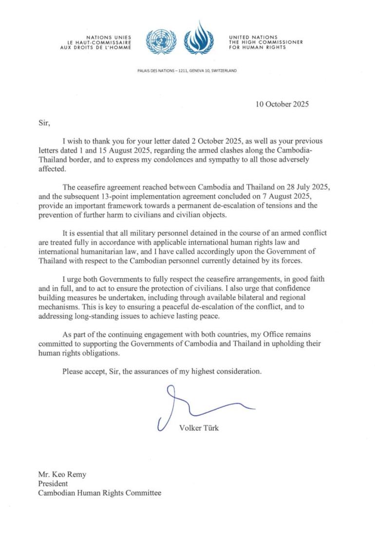 OHCHR ចាត់ទុកកិច្ចព្រមព្រៀងស្តីពីបទឈប់បាញ់រវាងប្រទេសកម្ពុជា និងថៃ កាលពីថ្ងៃទី២៨ ខែកក្កដា ឆ្នាំ២០២៥ និងកិច្ចព្រមព្រៀងអនុវត្តន៍ ១៣ចំណុច នៅថ្ងៃទី៧ ខែសីហា ឆ្នាំ២០២៥ គឺជាក្របខណ្ឌសំខាន់មួយ ដែលឆ្ពោះទៅរកការបន្ថយភាពតានតឹងជាអចិន្ត្រៃយ៍ និងការទប់ស្កាត់ការប៉ះពាល់ដល់ប្រជាពលរដ្ឋ និងទ្រព្យសម្បត្តិ របស់ប្រជាពលរដ្ឋ។