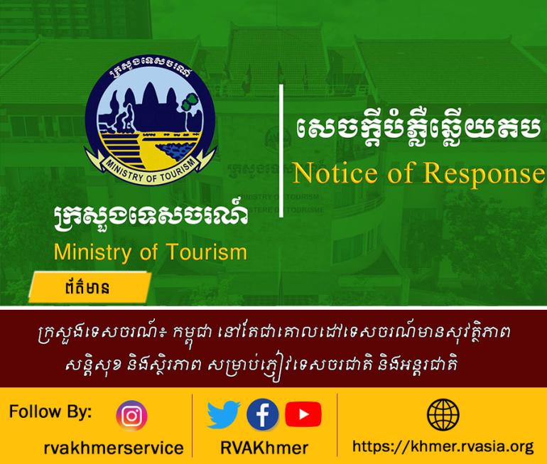 ក្រសួងទេសចរណ៍ បានធ្វើការបញ្ជាក់ថា ព្រះរាជាណាចក្រកម្ពុជា នៅតែជាគោលដៅទេសចរណ៍ មានសុវត្ថិភាព សន្តិសុខ និងស្ថិរភាព សម្រាប់ភ្ញៀវទេសចរជាតិ និងអន្តរជាតិ ។