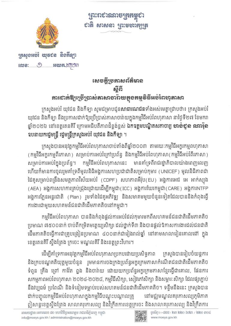 ក្រសួងអប់រំ យុវជន និងកីឡា បានចេញសេចក្តីប្រកាសព័ត៌មាន ដោយប្រកាសពីការដាក់ប្រើប្រាស់ភាសាចារ៉ាយ ក្នុងកម្មវិធីអប់រំពហុភាសា។