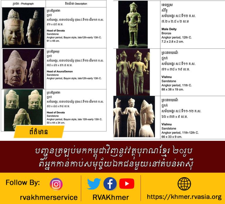 បញ្ជូនត្រឡប់មកកម្ពុជាវិញនូវវត្ថុបុរាណខ្មែរ ២០រូប ពីអ្នកកាន់កាប់សមុច្ច័យឯកជនមួយនៅតំបន់អាស៊ី