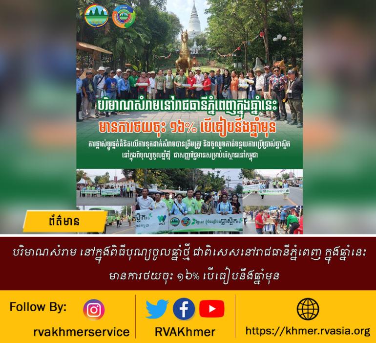 បរិមាណសំរាម នៅក្នុងពិធីបុណ្យចូលឆ្នាំថ្មី ជាពិសេសនៅរាជធានីភ្នំពេញ ក្នុងឆ្នាំនេះ មានការថយចុះ ១៦% បើធៀបនឹងឆ្នាំមុន
