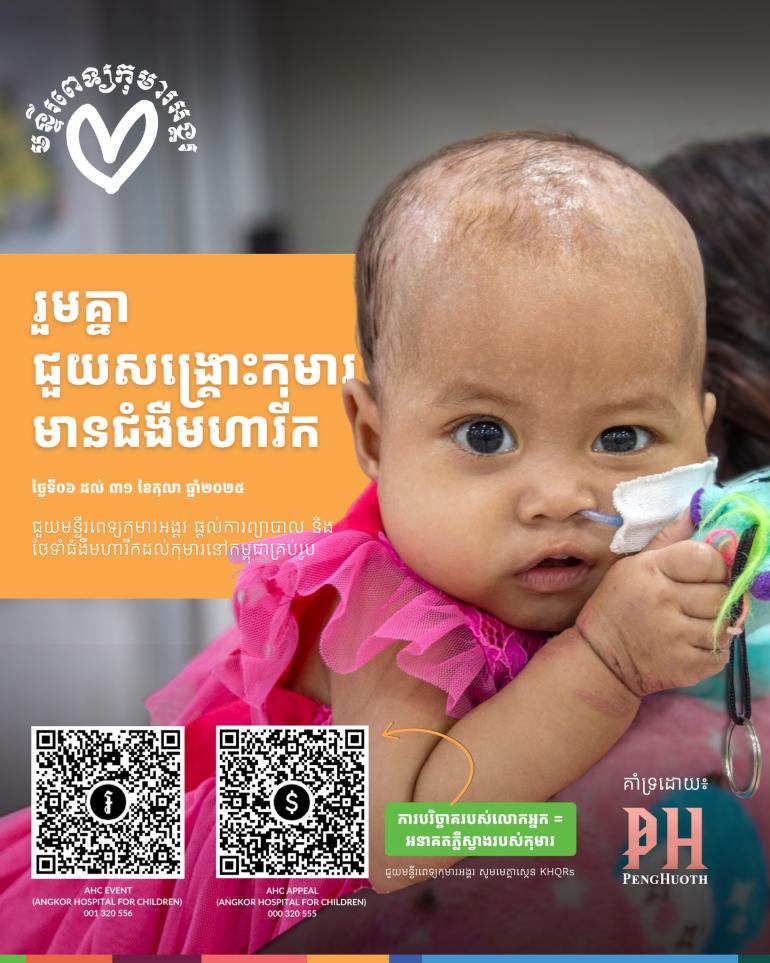 យុទ្ធនាការ «រួមគ្នាជួយសង្រ្គោះកុមារមានជំងឺមហារីក» ចាប់ពីថ្ងៃទី៦ ដល់ថ្ងៃទី៣១ ខែតុលា ឆ្នាំ២០២៥ មានគោលដៅ រៃអង្គាសថវិកាដើម្បីបំពេញនូវកង្វះខាតថវិកាមន្ទីរពេទ្យកុមារអង្គរចំនួន ២០០ ០០០ដុល្លារអាមេរិក ដែលអាចប៉ះពាល់ដល់មន្ទីរពេទ្យកុមារអង្គរដើម្បី បន្តផ្តល់ការព្យាបាល និងថែទាំសង្គ្រោះអាយុជីវិតរហូតដល់ដំណាច់ឆ្នាំនេះ។ លើសពីការរៃអង្គាសថវិកា មន្ទីរពេទ្យកុមារអង្គរ ក៏នឹងជំរុញការយល់ដឹងអំពីជំងឺមហារីកកុមារតាមរយៈការផ្សព្វផ្សាយលើវេទិកាឌីជីថល។