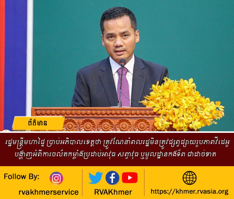 រដ្ឋមន្ដ្រីមហាផ្ទៃ ប្រាប់អភិបាលខេត្តថា ត្រូវណែនាំពលរដ្ឋមិនត្រូវផ្សព្វផ្សាយរូបភាព វីដេអូ បង្ហាញអំពីការចល័តកម្លាំងប្រដាប់អាវុធ សព្វាវុធ ឬមូលដ្ឋានកងទ័ព ជាដាច់ខាត
