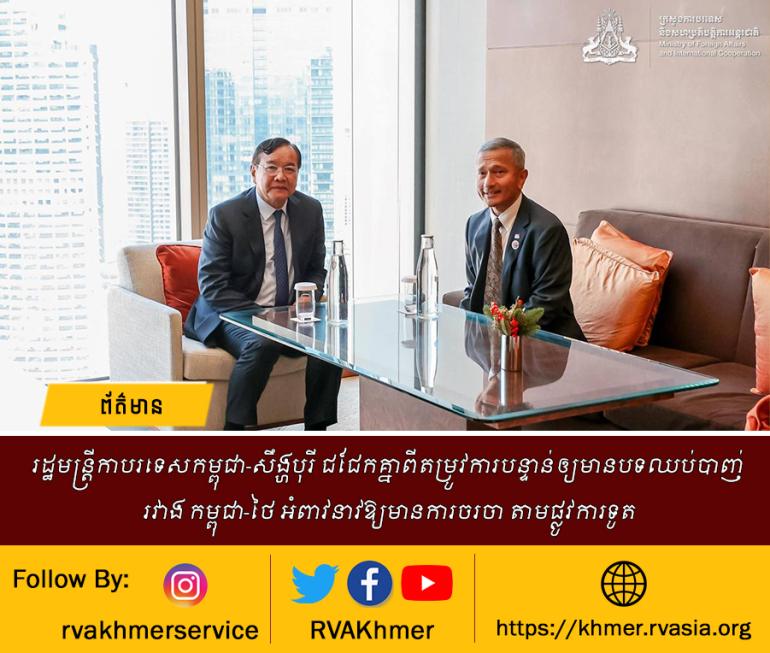 រដ្ឋមន្ត្រីកាបរទេសកម្ពុជា-សឹង្ហបុរី ជជែកគ្នាពីតម្រូវការបន្ទាន់ឲ្យមានបទឈប់បាញ់រវាង កម្ពុជា-ថៃ អំពាវនាវឱ្យមានការចរចា តាមផ្លូវការទូត