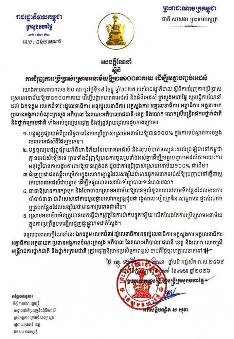 លោកឧបនាយករដ្ឋមន្ដ្រី ស សុខា រដ្ឋមន្ដ្រីក្រសួងមហាផ្ទៃ នៅថ្ងៃទី២៧ ខែមេសា ឆ្នាំ២០២៦ បានចេញសេចក្តីណែនាំ ស្តីពី ការជំរុញការប្រើប្រាស់ស្រោមអនាម័យឱ្យបាន ១០០ភាគរយ ដើម្បីរួមគ្នាបញ្ចប់អេដស៍ ពីដៃគូរួមភេទ។