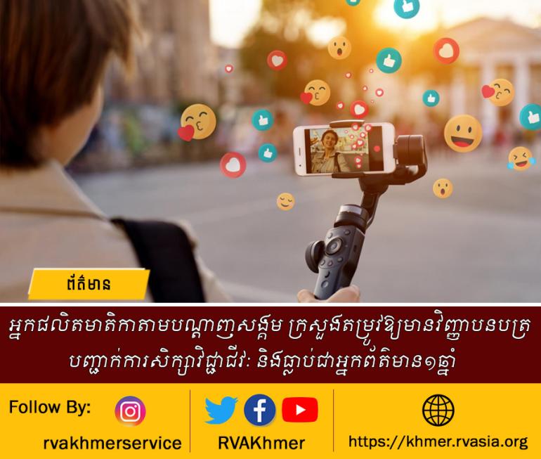 អ្នកផលិតមាតិកាតាមបណ្តាញសង្គម ក្រសួងតម្រូវឱ្យមានវិញ្ញាបនបត្របញ្ជាក់ការសិក្សាវិជ្ជាជីវៈ និងធ្លាប់ជាអ្នកព័ត៌មាន១ឆ្នាំ
