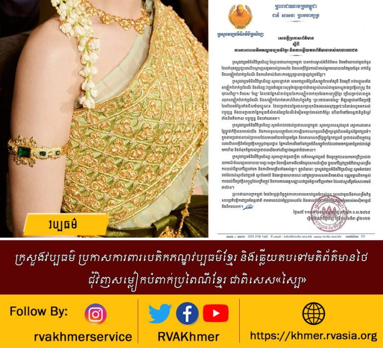 ក្រសួងវប្បធម៌ និងវិចិត្រសិល្បៈ បានចេញសេចក្តីប្រកាសព័ត៌មានស្តីពីការការពារបេតិកភណ្ឌវប្បធម៌ខ្មែរ និងការឆ្លើយតបព័ត៌មានរបស់សាធារណជន បន្ទាប់ពីក្រសួងបានកត់សម្គាល់ព័ត៌មាន និងមតិយោបល់មួយចំនួនដែលកំពុងផ្សព្វផ្សាយលើបណ្តាញសង្គមនៅប្រទេសថៃ ព្រមទាំងសេចក្តីថ្លែងការណ៍របស់អ្នកនយោបាយថៃមួយចំនួន ពាក់ព័ន្ធនឹងសម្លៀកបំពាក់ប្រពៃណី និងការជំទាស់ចំពោះការផ្សព្វផ្សាយបង្ហាញវប្បធម៌ខ្មែរ។